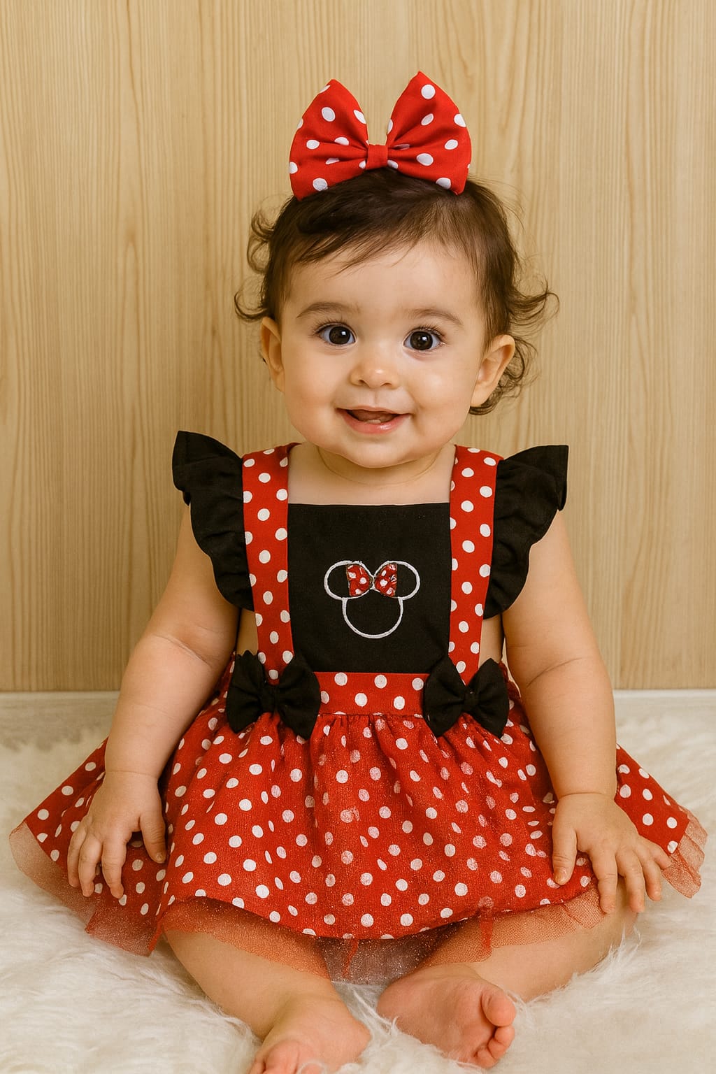 Jardineira Minie Vermelha Tule Vermelho +Laço